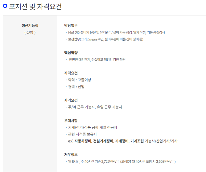 - ▲ 생산 설비 운영 및 유지보수: 음료 생산 라인의 효율적인 운영 및 정기 점검, 문제 발생 시 신속한 대응