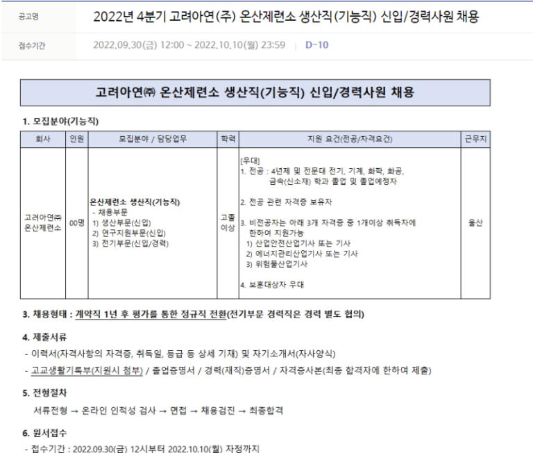 고려아연 생산직 자소서 항목 분석 및 합격 전략