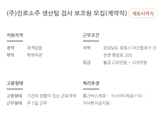 창원) 진로소주 생산직(계약직) 채용공고 및 정보, 연봉