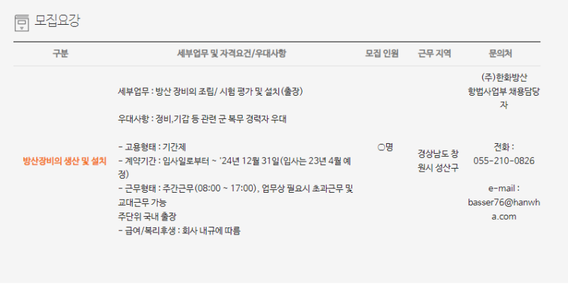 한화는 1952년 설립된 대한민국 대표 기업집단 중 하나로, **방산, 항공우주, 화학, 에너지, 금융, 유통, 건설** 등 다양한 사업 분야에서 세계적인 경쟁력을 갖추고 있는 글로벌 기업입니다. 특히, **방산 및 항공우주 분야**에서는 독보적인 기술력과 인프라를 바탕으로 미래 기술을 선도하며 국가 산업 발전에 기여하고 있죠. 🚀 이번에 채용이 진행된 **창원 사업장**은 한화의 핵심 제조 거점 중 하나로, 정밀 기계 및 첨단 부품 생산의 중심지라고 할 수 있습니다. 끊임없는 **도전과 혁신**을 통해 인류의 삶에 기여하는 한화의 비전에 발맞춰, 우수한 생산 인력을 확보하려는 노력이 엿보이는 채용이라고 할 수 있어요!