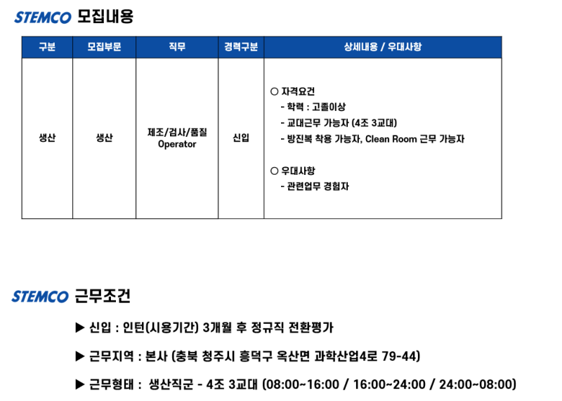 채용공고 스템코 생산직 주요 업무 (생산) 🏭