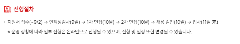 ✔ 인재상: 도전적 창조인, 전문적 완결인, 소통적 협력인 – 빠르게 변화하는 환경 속에서 새로운 기술과 아이디어를 제안하고, 전문성을 바탕으로 최고의 성과를 창출하며, 열린 마음으로 협력하는 인재를 중요하게 생각합니다.