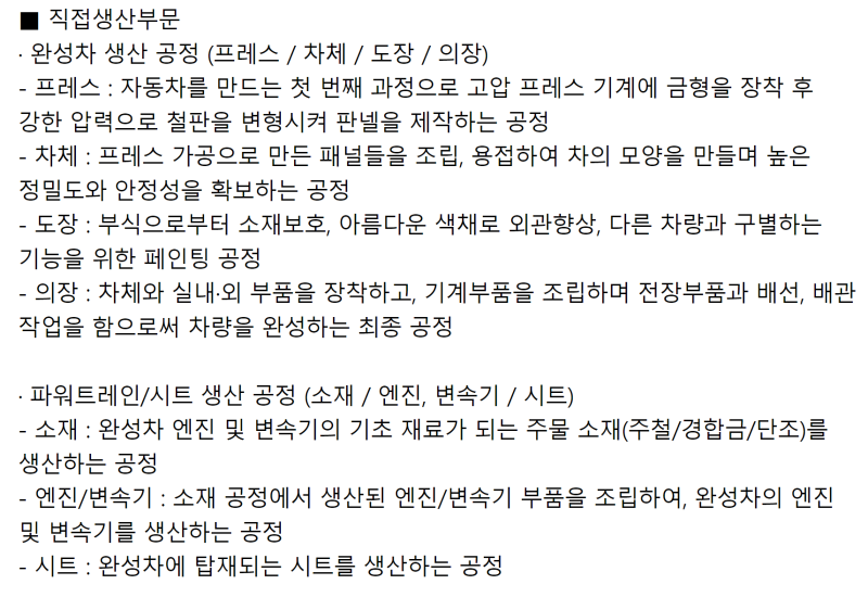 • ▲ 차량 부품 조립 및 생산 공정 수행: 정해진 생산 라인에서 부품 조립 및 생산 활동